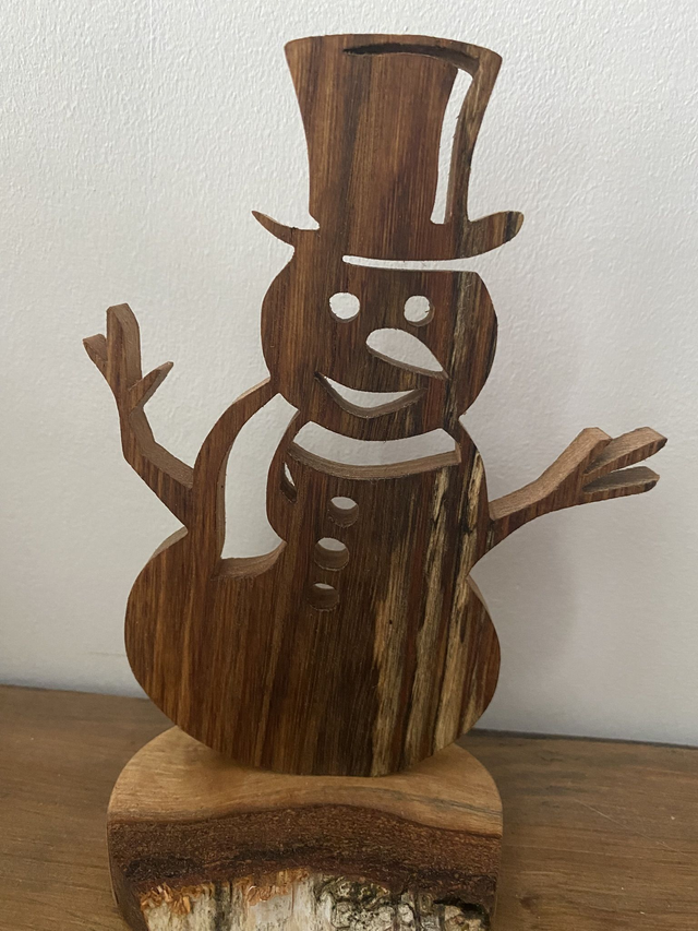 Bonhomme de neige réalisé en chêne avec un socle en bouleau