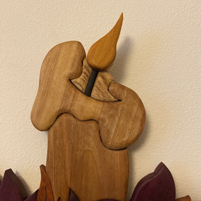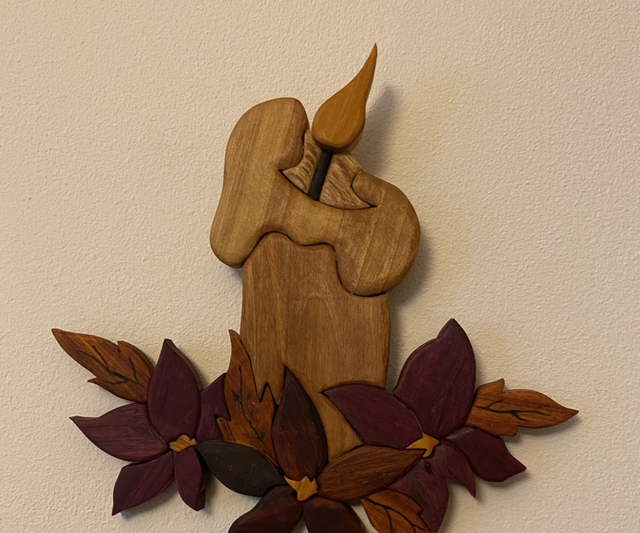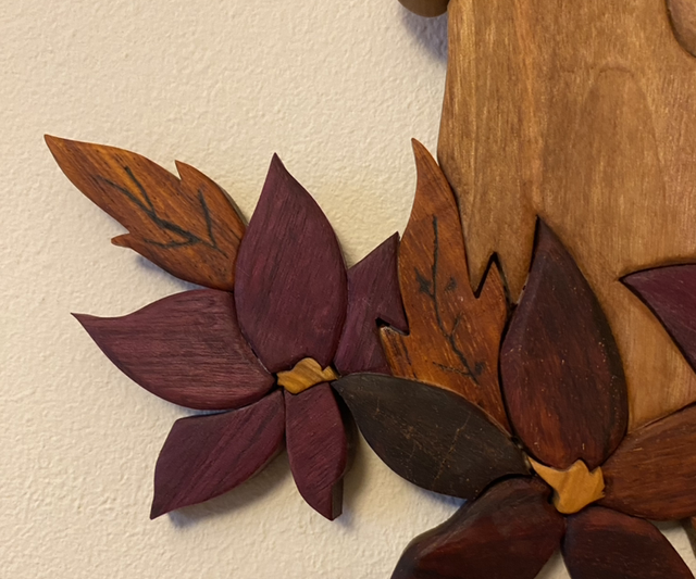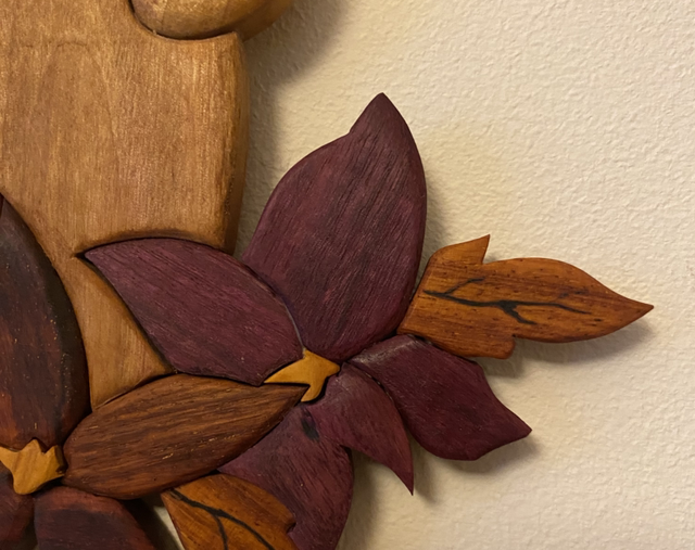 Création à accrocher réalisée en intarsia avec plusieurs essences de bois :
