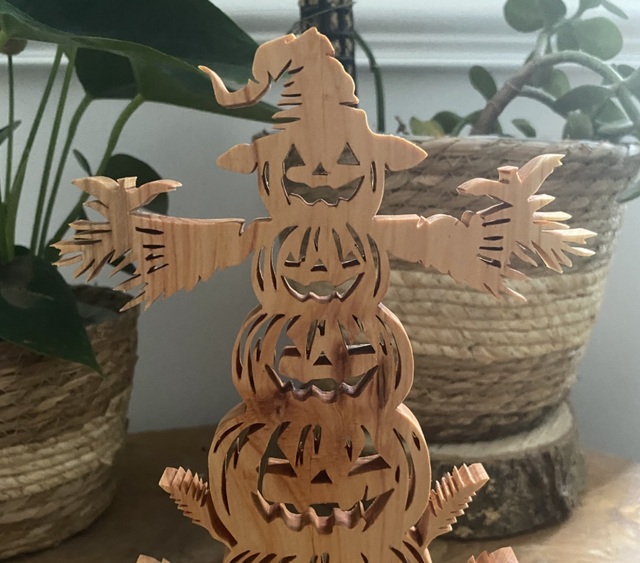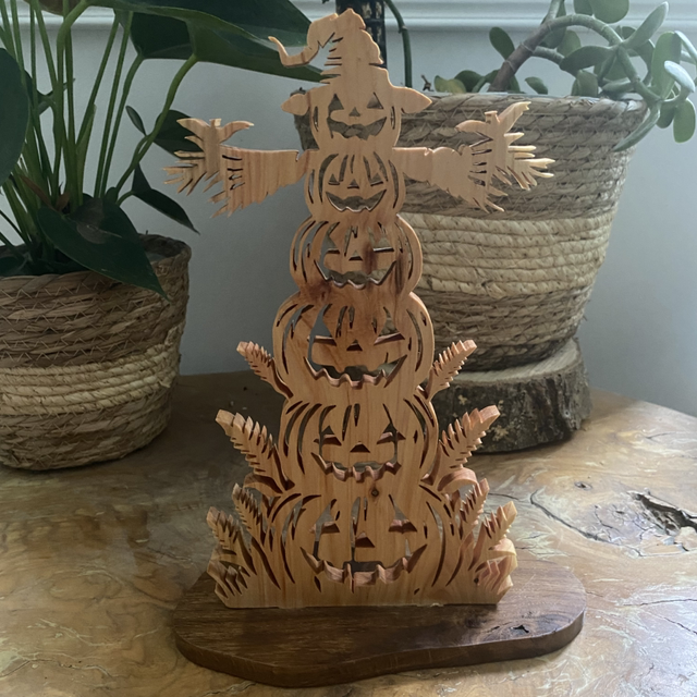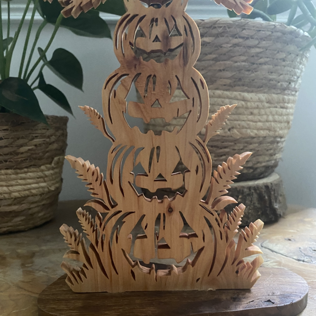 Décoration à poser, chantournée dans du sapin avec un socle en vieux chêne.