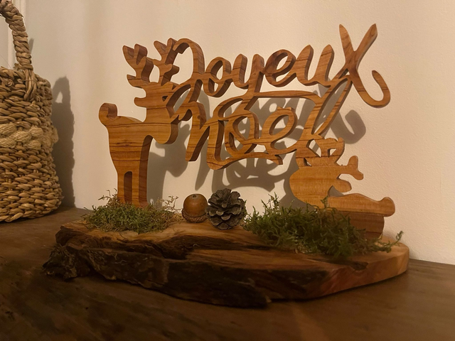 Joyeux noël réalisé en bouleau sur un socle en thuya