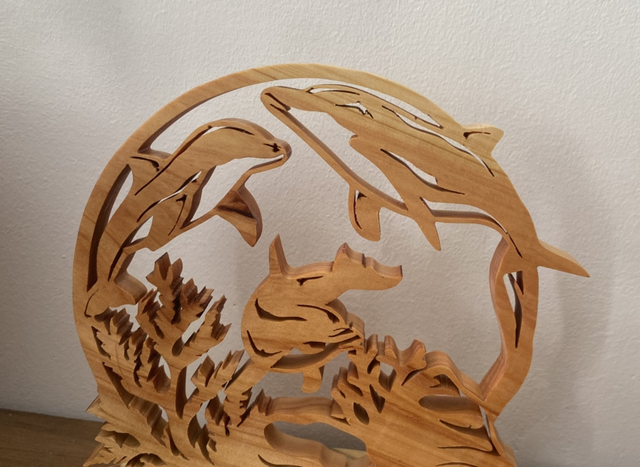 Décoration dauphin réaliser en sapin sur socle en peuplier